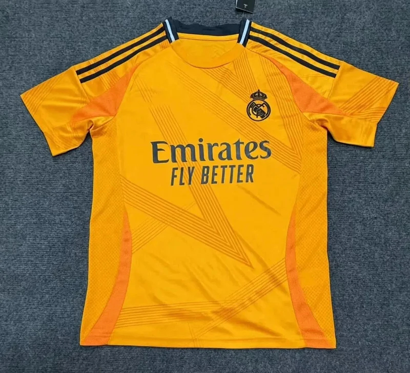 The 2024 away shirt’s core lies in its bold and meaningful design. Dominated by a vibrant orange tone, it is a deliberate tribute to Real Madrid’s iconic 2013/14 third kit, which accompanied the team to win the historic 10th Champions League title ("Decima"). Subtle astral star patterns are woven into the fabric, symbolizing the bond between the team and fans under the same starry sky, no matter where they compete away from the Santiago Bernabéu. Black shoulder stripes, round neck trim, and contrasting logos create a sharp visual impact, enhancing the shirt’s dynamic and modern appeal.